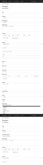Eine Veranstaltung benötigt mindestens einen Titel, Veranstalter/Bereich und ein Datum.